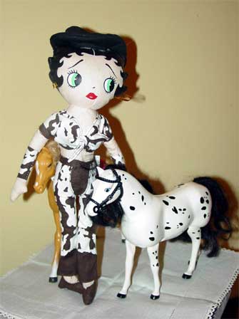 "Cow Girl Betty" Betty Boop by Kings Features Syndicate, Inc./ Fleischer Studio, Inc. Trademarked by The Hearst Corporation/Fleischer Studios, Inc. Manufactured by Kellytoy, 2002. Betty Boop in her faux cowhide suit is ready for riding the range. She is all cloth and is approximately 12 inches tall and has nonremovable clothes.