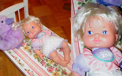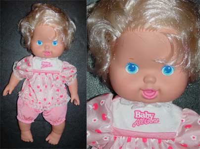 "Baby All Gone", tagged Kenner, 1991, wearing her original clothes. Her outfit has her name printed on it and is removable. She has short blonde hair and big blue painted eyes. She has a very soft stuffed body with a vinyl head, arms and legs.