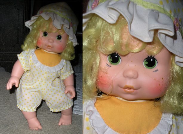Strawberry Shortcake's friend, a Kenner 1982 Lemon Meringue Blow-a-Kiss, copyright 1982 by American Greetings, made in Hong Kong. She is wearing her original clothes and hat.