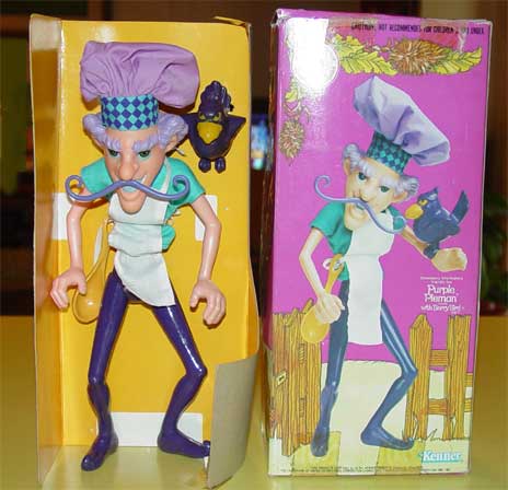 "Welcome to the World of Strawberry Shortcake", this is Strawberry Shortcake's friendly foe Purple Pieman with Berry Bird Pet. Still in the original box this doll is Cinnamon Apple Pie scented. Marked "CPG Products Corporation 1982 by its Div. Kenner Products. Trademark of American Greetings Characters 1980, 1981." on the original box. "The Berry Bird can perch on the arm of the Purple Pieman." "His shirt and apron are removable for dressing fun."