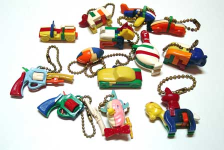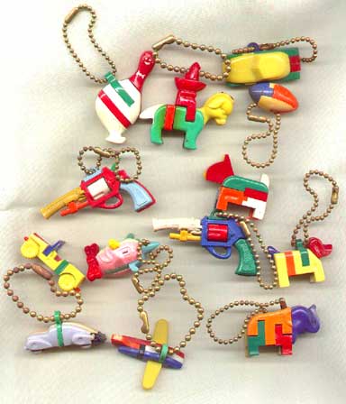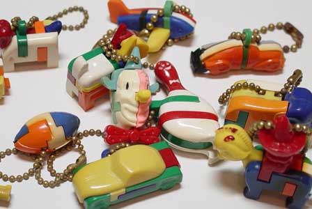 Little plastic puzzles on keychains were popular in the mid 1940s. Most drug stores carried them and they were displayed on rotating racks. There were many choices including different animals and figures. Each had its own key part for dissembling and reassembling the puzzle.