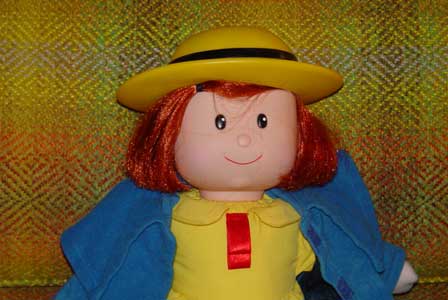 Madeline by Kids Gifts, 1998. Madeline is aproximately 16 inches tall and dressed in her original clothes. She has a vinyl head and hat and a plush body.
