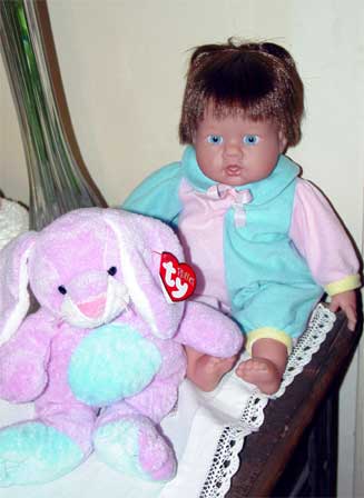 #020400 by Lee Middleton Original Dolls, copyright 2000 by Reva. A 12" glass-eyed doll who can put her thumb in her mouth. She is not wearing her original clothes but is a beauty with pretty bright aqua eyes and short dark brown hair.