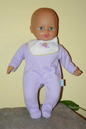 "Especially Yours" manufactured by Lotus Onda Industrial Co., Ltd., copyright 1994 by Geoffrey's, distributed by Toy-R-Us. There is a speaker and battery holder inside the doll so she probably cries or makes sounds of some sort. She is wearing a lavender onsie with a big white collar trimmed in yellow lace that is tagged "Fisher Price". She is approximately 14 inches long and has open/close eyes, a soft body, and a vinyl head, arms, and legs.