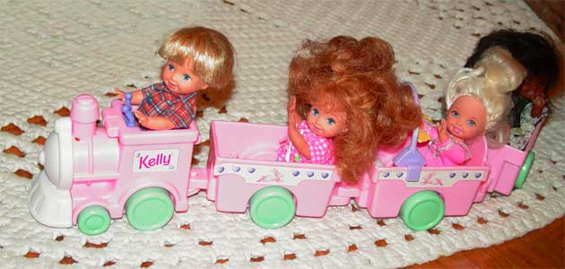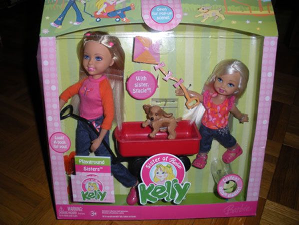 2006 "Playground Sisters" by Mattel. Here is Kelly, sister of Barbie, and her sister Stacie. Kelly, on the right, giggles and is flying a kite, Stacie is pulling a red wagon with their brown puppy inside. Made in Indonesia, Kelly is approximately 6 inches tall and Stacie is approximately 9 inches tall.