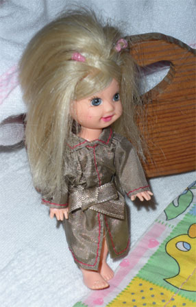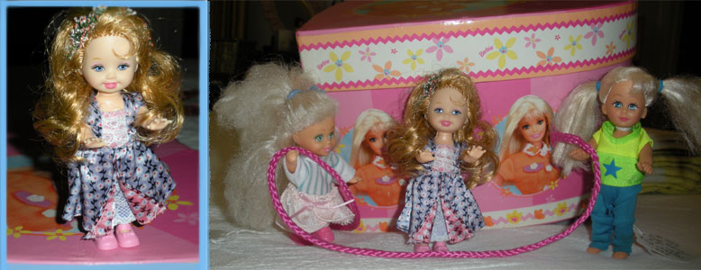 Mattel's 1996 Kelly is all dressed up for a party. Flowers adorn her strawberry blonde hair and her satiny dress is trimmed in lace. Kelly is 4 inches tall, and about the same height as all of her friends. She won't get her dress dirty jumping rope because it's just too much fun.
