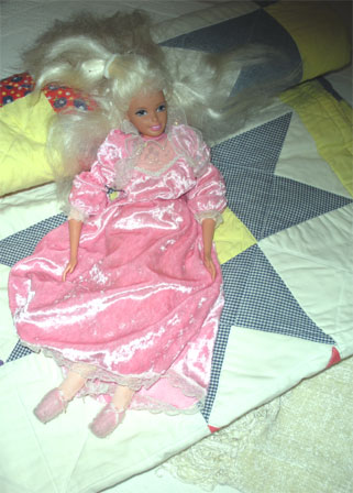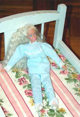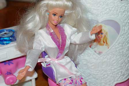 Mattel's 1999 Slumber Party Barbie. She is a soft-bodied Barbie and is wearing her original light blue pajamas.
