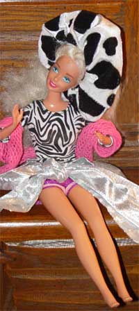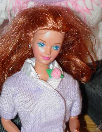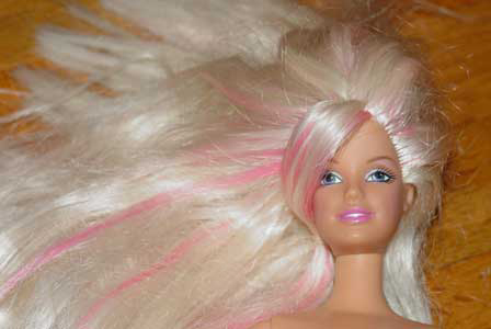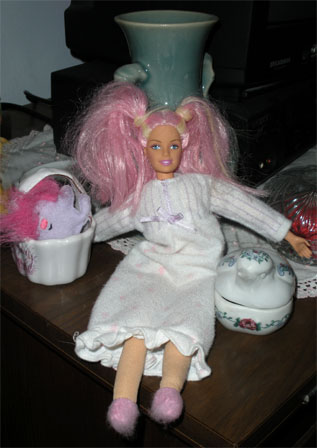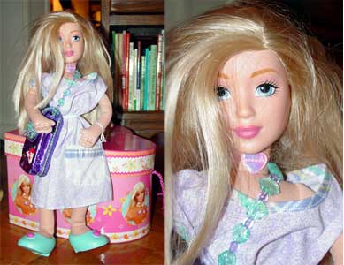 Mattel's 2001 soft body Barbie. She has pink hair highlighted with white, a soft body and a vinyl head, arms and hands. She is wearing a Barbie nightgown that has lavendar stripes and pink hearts but it is not the nightgown that she came in originally. She is approximately 11 inches tall and has pink slippers that are not removable.