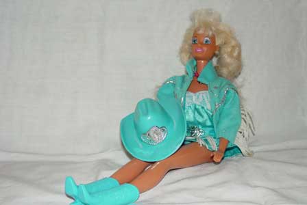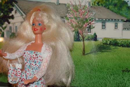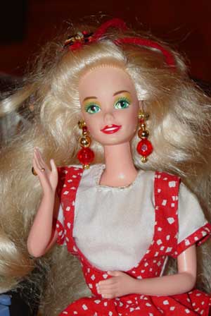 Mattel's 1995 "Little Debbie" Barbie II. She is wearing her long gingham dress but her hat is missing.