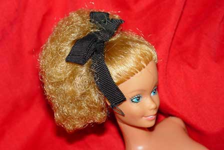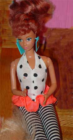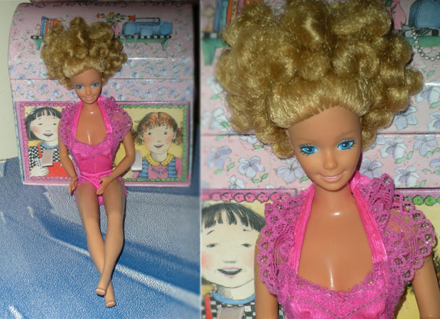 Mattel Barbie with a curly ponytail. She is marked "Mattel, Inc., 1966, Taiwan" on her back. This is Magic Curl Barbie from the early 1980's. Her hair can be "straightened" with a powder solution mixed with water. She is not wearing her original clothes but the clothes she is wearing have metal snaps which would indicate it is a little older than ones with plastic snaps or velcro. This swimsuit may be from the 1979 Beauty Secrets Barbie. Originally, Magic Curl Barbie was dressed in a yellow peasant or country style dress with short sleeves. Her accessories included a yellow wash cloth and towel with elastic at the top to slide on when doing her hair.