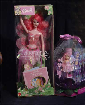 Barbie Fairytopia Sparkle Fairy and Pedal Pixies Fairies by Mattel. Inc., copyright 2004. Mattel and the Entertainment Industry Foundation (EIF) are working together in the U.S. to raise awareness for arts education for children. "Barbie Cares, Supporting Children in the Arts". The box states, "If you're pure of heart, kind in spirit, and truly believe in your wildest dreams, you will find your way to the faraway world of Fairytopia(tm). There you'll find all the magical creatures of your fantasies. What are you waiting for? Journey to Fairytopia(tm)."