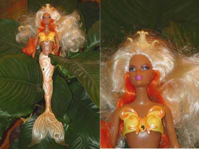 Mattel's Mermaid Barbie marked (c) 1990 on the back of her head and (c) 2002 on her body. Her hair is blonde with orange highlights and her rubber like mermaid body is made to be part of her. Her bathing suit top and tiara are both made from hard plastic.
