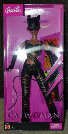 Barbie Catwoman from the 2004 movie "Catwoman" that stars Halle Berry. "From super shy to to Super Hero...Patience Phillips is a shy artist who works for Hedare Beauty Cosmetics Company. Patience discovers a dark secret: one of the company's new products will disfigure women after repeated use. Now Patience is in danger! When a mysterious cat saves her life by licking her on the face, ...Patience is changed forever and Catwoman" is born! Now the criminals will run for their lives."