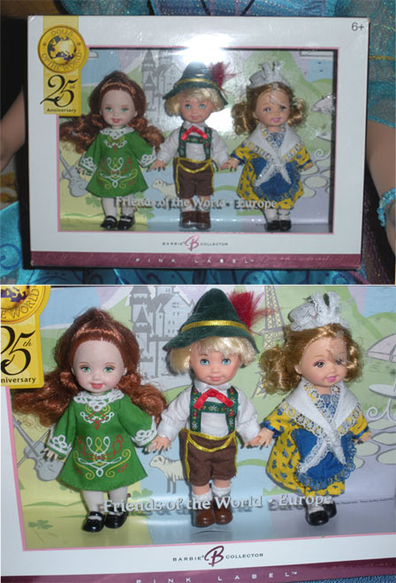 "Friends of the World - Europe" Barbie Collector, Pink Label, copyright 2005 Barbie Collector, the Barbie Collectible/Specialty Doll Division of Mattel, Inc. Dolls of the World 25th Anniversary. The back of the box has a printed Post Card postmarked " Beautiful Europe"which reads, "Hello, friends! We love getting to know about different people from around the world! We are from Europe. Ireland is famous for its beautiful, green countryside and the delicate lace and warm sweaters we make. Paris, the capitol of France, is called the City of Light. My country is known for wonderful fashion and food. Germany is famed for its many astles and the Black Forest. The traditional German outfit for girls is called a dirndl. Come visit us someday and learn more about our countries!" These "Kelly" dolls cannot stand alone. Colors and decorations may vary from those shown. Kelly (r) doll and friends, Friends of the World (tm) - Europe Giftset, costumes are not removable.