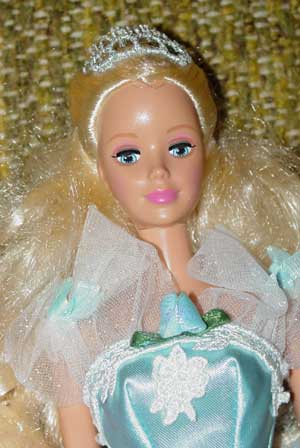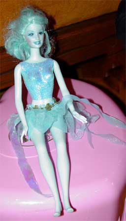 Mattel's Fairytopia Barbie in blue. Her head has a 1998 copyright and her body a 1999 copyright. She has pale blue "skin" with a glitter embedded and light blue hair that has glitter embedded in some of the strands.