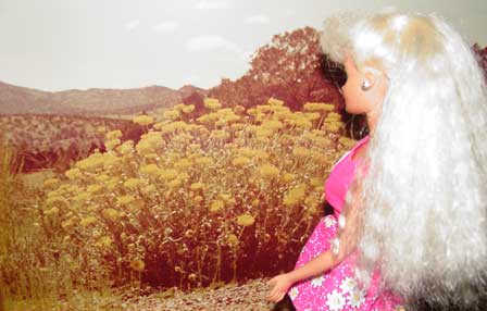 Barbie admires the beautiful bouquet of yellow flowers growing along side the roadway on Mt. Locke.