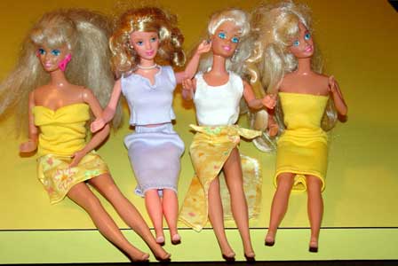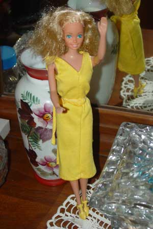 A bright yellow one-piece knit dress made by Kay has just been added to Barbie's wardrobe. A cool summer knit dress that Barbie enjoys wearing and one that works well for vacationing since it stays wrinkle-free when packed. Barbie was also very happy that the dress perfectly matched a pair of her "old" yellow shoes.