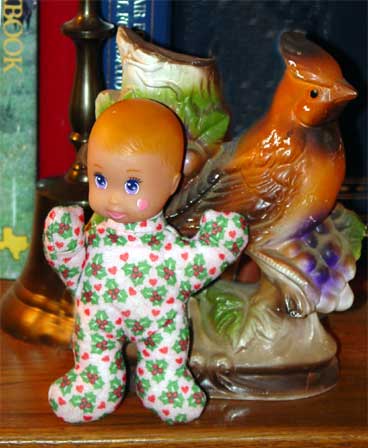 Mattel's 1993 Holiday Doll made for McDonald's. A 4.5 inch doll with a vinyl head and a soft body. The fabric on the body is a Christmas print. His cute little painted face has a pink heart on his left cheek and purple and blue eyes.