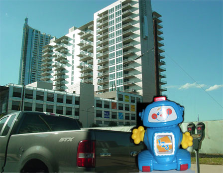 Made for McDonald's, 2003, Fisher-Price blue robot. The little blue robot will deposit money into the parking meter as needed, watch for the Meter-maid, keep the truck secure, and be waiting for the truck's owner when she finishes shopping and keep her company on the ride home. He's also capable of driving the truck home but so far no one will issue him a TXDL.