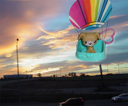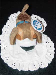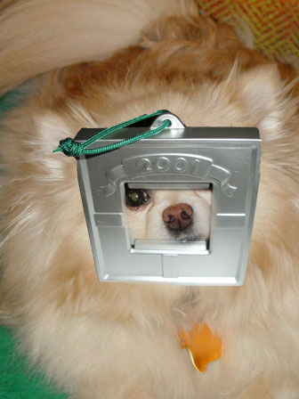 Made for McDonald's, 2001. Silver colored Happy Meal's picture frame. She always wanted to be in pictures. If a picture frame will do, she almost made it. (Note: this picture was created digitally by combining two photographs, the picture frame was not on the dog's nose.)