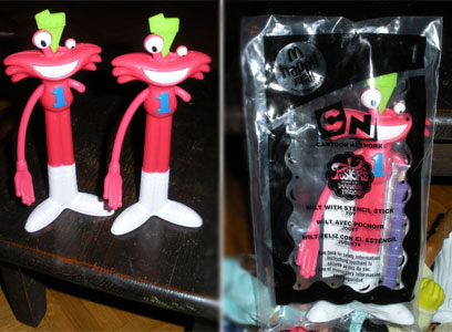"Wilt" one of Foster's Home for Imaginary Friends, mfg. for McDonald's, copyright Cartoon Network, 2007. McDonald's 2007 Cartoon Network Happy Meal activity figure toys each come with a different colored pencil: (1) (Wilt with Stencil Stick), (2) Blooregard Wacky Writer, (3) Swinging Jake, (4) Bull Pencil Chomper, (5) Leon Side Spinner, (6) Nutty Rodney, (7) Raj's Cracked Up Canoe, and (8) Lazlo.