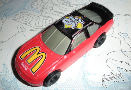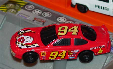 McDonald's Happy Meal toy. Hotwheels manufacturered by Mattel, 1998 for McD's Corp. #94 car sponsored by Happy Meal, Service Merchandise, Ford, NASCAR, Reese's Peanut Butter Cups, Motel 8, Coca Cola, Union 76, and others. Ronald McDonald's picture is on the hood of the car.
