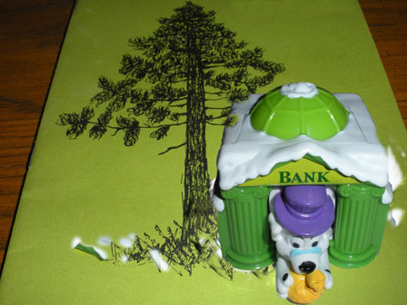 Made for McDonald's. Snow covered bank building w/ a dog inside. It's cold outside but business must go on.