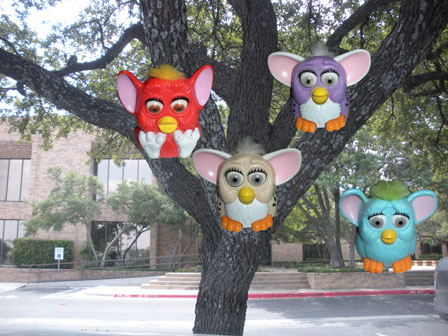 Manufactured for McDonald's Furby toys. Red Furby has a tuff of yellow fur and makes noise when turned upside down, copyright 1998 Furby, trademark Tiger Electronics. Purple Furby has black spots and orange feet, (c) 1998, TM Tiger Electronics. His white fur goes from his head to his tail. His ears, eyes, beak, and feet are movable. The tan colored Furby also has black spots, orange feet and white fur that goes from his head to his tail, copyright 1998, TM Tiger Electronics. The aqua colored Furby, (c) 1998, TM Tiger Electronics has lime green fur from his head to his tail. He has rollers but his ears, eyes, beak, and feet are stationary. Today all four Furbys are sitting in a tree while they visit.