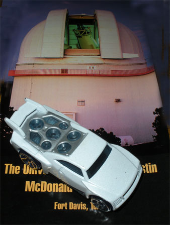 Mfg. for McDonald's, 2005 Mattel, Inc., made in China, C-SN. Pearlized white car with a big spoiler and something that may represent solar panels.