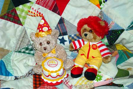 Celebration bear with his cake and Ronald McDonald Bear manufactured by Build-a-Bear Workshop. Each bear is approximately 7 inches tall and are celebrating McDonald's birthday in 2005.