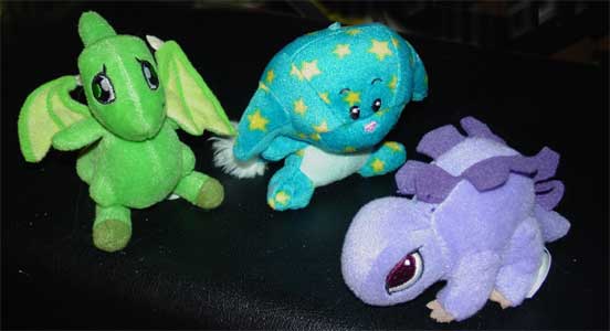 McDonald's Happy Meal's neopets plushies. The purple and the starry blue one are from 2005 and Green Shoyru is from 2004.