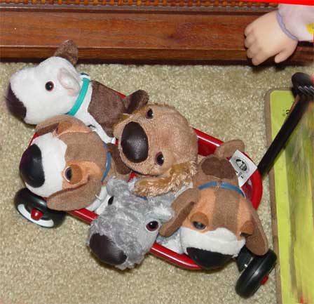 McDonald's Happy Meal toys, The Dog, 2004, was a set of 12 dogs. Pictured is a group of five which includes four different dogs: #7 Bull Terrier, #8 Cocker Spaniel, #6 Beagle, #11 West Highland Terrier, and a second #6 Beagle.