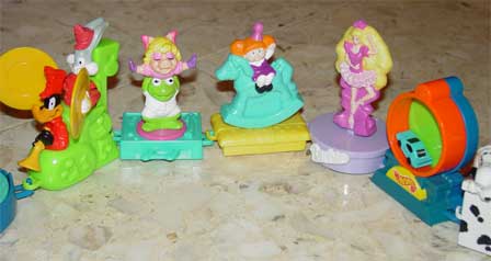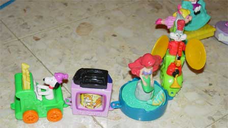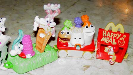 A favorite, the 1994 McDonald's Happy Meal Happy Birthday toy train. Each train car represents a favorite toy or character and each one has moving parts that move when the train is moving.