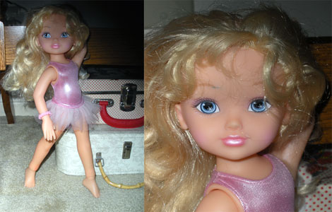 Micro Games of American (MGA) "My Beautiful Ballerina" doll, marked 2002. She is wearing her original pink ballerina outfit and her ballet beam (not pictured) but is missing her tiara and shoes. She is approximately 14 inches tall and is a slim doll with blonde hair. When the ballet beam is pressed it plays ballet music. When she was new she also came with a mirror, interactive ballet mat, "How To" Ballet book, and hairbrush.