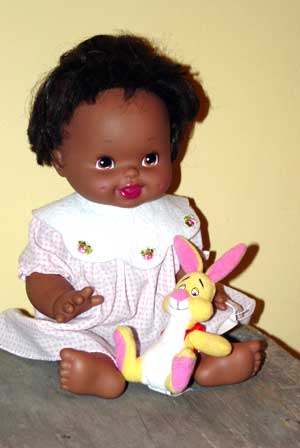 Micro Games of American (MGA) doll, "My Dream Baby", copyright 2000. This is an interactive doll that came with a control box and accessories and worked with batteries. She is wearing her original clothes except for her house slippers (that have little bird faces on top) that belong to someone else. "My Dream Baby" is 18 inches tall and a heavy doll for her size, her legs have hip, knee, and ankle joints.