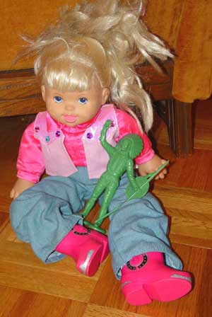 Micro Games of American (MGA) interactive doll marked 2001. She is approximately 16 inches tall and wearing her original clothes. Her painted face with big blue eyes and a smile make her look happy. Her pink star barrette is borrowed from a friend and is not her. With batteries (3 AAA, 1 9V) she is sensory powered and interactive.