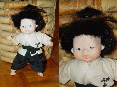Asian martial arts doll by Mieler Dolls Limited, Mikkel B. Jacobsen, British Reg. Design, copyright JMB Jacobsen. All dressed up, this little guy is ready to take on his opponent.