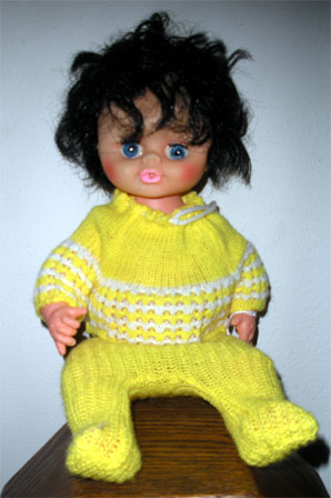 Made in Hong Kong is the only identifing marks on this doll, her age or her manufacturer is not known. She is approximately 13 inches tall has black rooted hair and long black eyelashes on her glass-type blue eyes that do not open or close. She is an all plastic doll. It is unknown whether her yellow knit outfit is original or not.