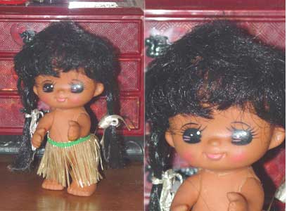 A 4 inch all vinyl doll marked on the bottom of her foot, "Hong Kong". She has a painted face and rooted black hair. Her arms are jointed at the shoulders and move but her legs are fixed. She is wearing a hula skirt that is not removable.