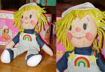 A little vintage "rag-boy", made in Hong-Kong. He has no other identifying marks and is approximately 12 inches tall. His yellow yarn hair topped with a white cap and wearing white overalls with a rainbow printed on the bib. He isn't in perfect condition but he is sure a cutie!!
