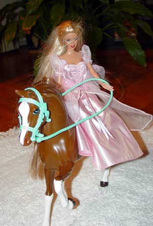 Barbie is riding the pretty brown and white horse.