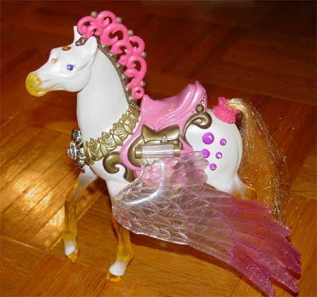 A white plastic horse that is approximately 4 inches tall with a brown soft plastic saddle. He loves to play in the alleys, and no one seems to mind.