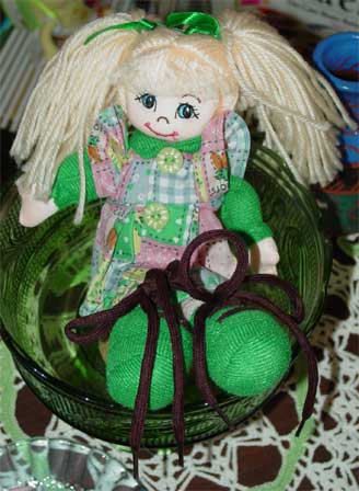 A perfect example of a mass produced plush doll. This 8 inch doll by Nanjing Polaris Gifts, R & D Co., Ltd. She has an embroidered face on a synthetic type fabric and yarn hair. Her clothes are non-removable with the sleeves and shoes being made as part of her body. Nanjing Polaris claims to be one of the leading suppliers of dolls since 1996 in China with their 2003 export turnover reaching "USD 5 million". They control five doll factories which employ 1,000 workers and have the capabilities of producing 500,000 dolls each month.