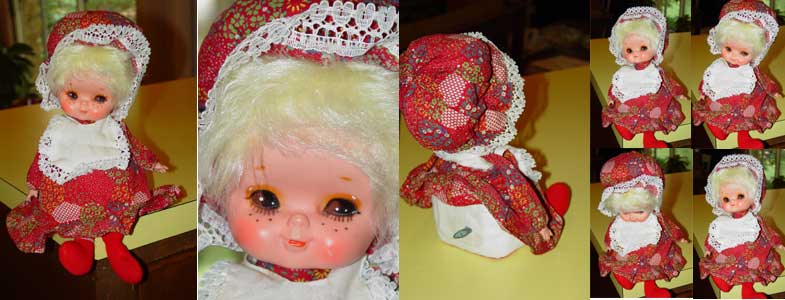 A vintage music box doll by Norleans made in Japan. She is a shelf sitter with a red print gingham dress with a white color. She has platinum blonde hair and freckles. While sitting she is approximately 7 inches tall. Her head and hands are vinyl. Her music box plays "Rock a Bye Baby" and when its playing her head rotates.