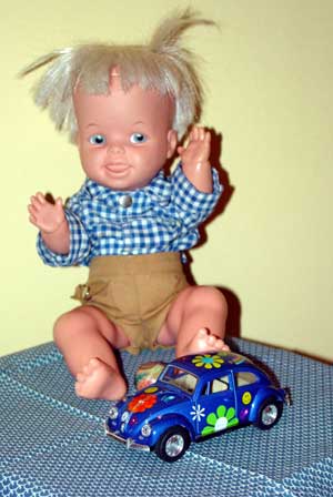 A little boy doll by Palitoy in England. His name, year of production and whether his clothes are original is unknown. When his left arm is moved up and down his mouth opens and closes. His favorite toy is this 1967 VW Bug, "Love" Beetle by Kinsmart