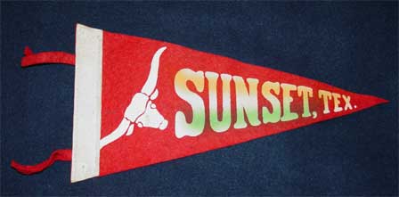 Late 1940s or early 1950s Pennant from Sunset, Texas. Sunset is located about fifteen miles south of Montague in southern Montague County. A Butterfield Overland Mail station was located two miles from the present townsite. The first settlers came from Denton County in 1870. Sunset remained a thriving market center for the first four decades of the twentieth century. The Great Depression, World War II, the mechanization of farming, and a decline in the size and number of ranches contributed to a decline in businesses and population. In the late 1950s Sunset had 260 residents and eight businesses. Those figures decreased to 200 residents and four businesses by the late 1980s. In 1990 the population was 200.