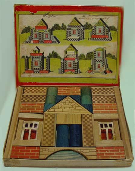 A set of Lyn's wooden blocks from the 1930s. This small set of blocks was "Made in Japan". The entire box of blocks measures 5" x 6.5" x .5" and includes enough blocks to build the building fronts shown on the box. The set includes two windows that have cellophane for glass. There are 28 blocks in this complete vintage set that is approximately 68 years old.
