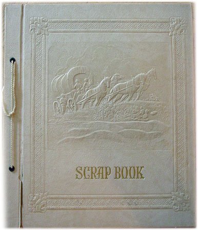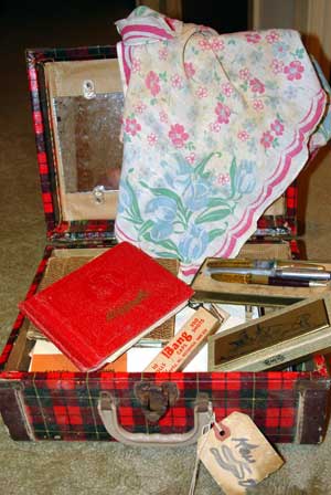 A few items that span about two decades are shown in this photograph. In the 40s before going outside to play it was customary to wear a kerchief so the wind wouldn't cause an earache. In the 50s playing cowboys with caps in a cap pistol was a fun game and also taking an autograph book to school for friends and teachers to sign with their autograph and possibly a verse was commonplace. The little plaid suitcase is from the 1950s and was used for dolls and doll clothes.