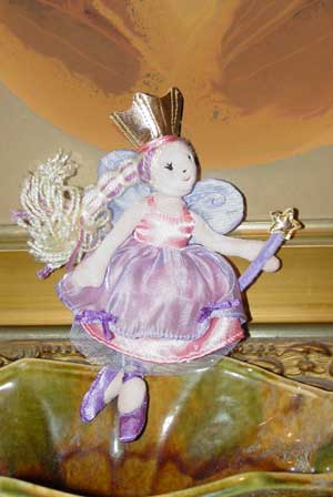 Play Wonder Pop-up Castle Princess, distributed by Target Stores. This plush Princess, without her soft Pop-up Castle, is wearing non-removable purple and pink clothes and is approximately 7.5 inches tall. She has a gold colored crown and a gold star on her wand. Her yarn hair has purple highlights.
