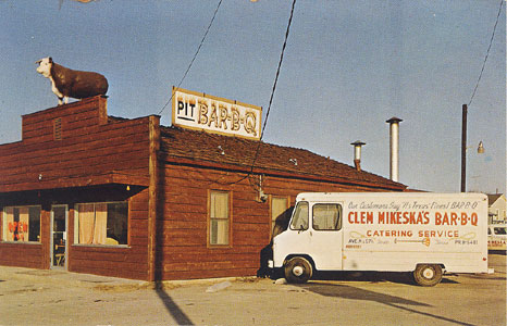 "Clem Mikeska's Bar-B-Q, 57th Street at Ave. M, Temple, Texas. "Our customers say it's Texas! finest Bar-B-Q" "Specializing in Premium Omaha corn fed beef carefully cooked, served with our speical sauce, and our own home made sausage served cafeteria style, or take out. We cater any size group, anywhere in Texas. Try us, you'll be glad you did." Card No. 67998, Walt Hawkins, Assoc. of Temple.